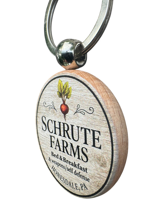 Schrute Farms Keychain, Funny Office Inspired Gift, Wood Round Keychain, White Elephant Gift