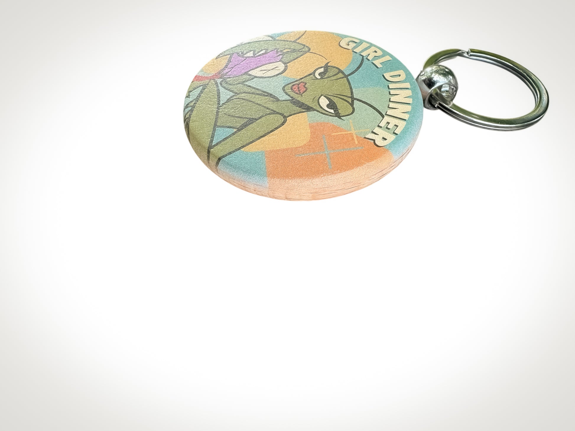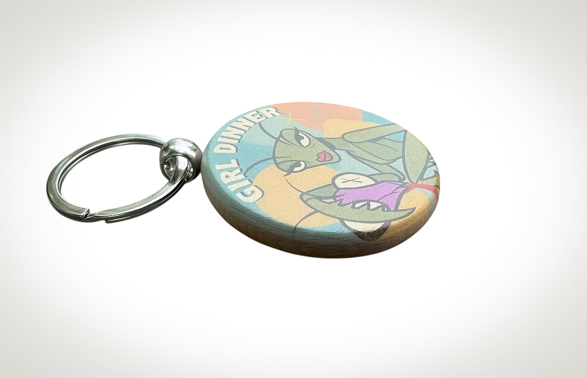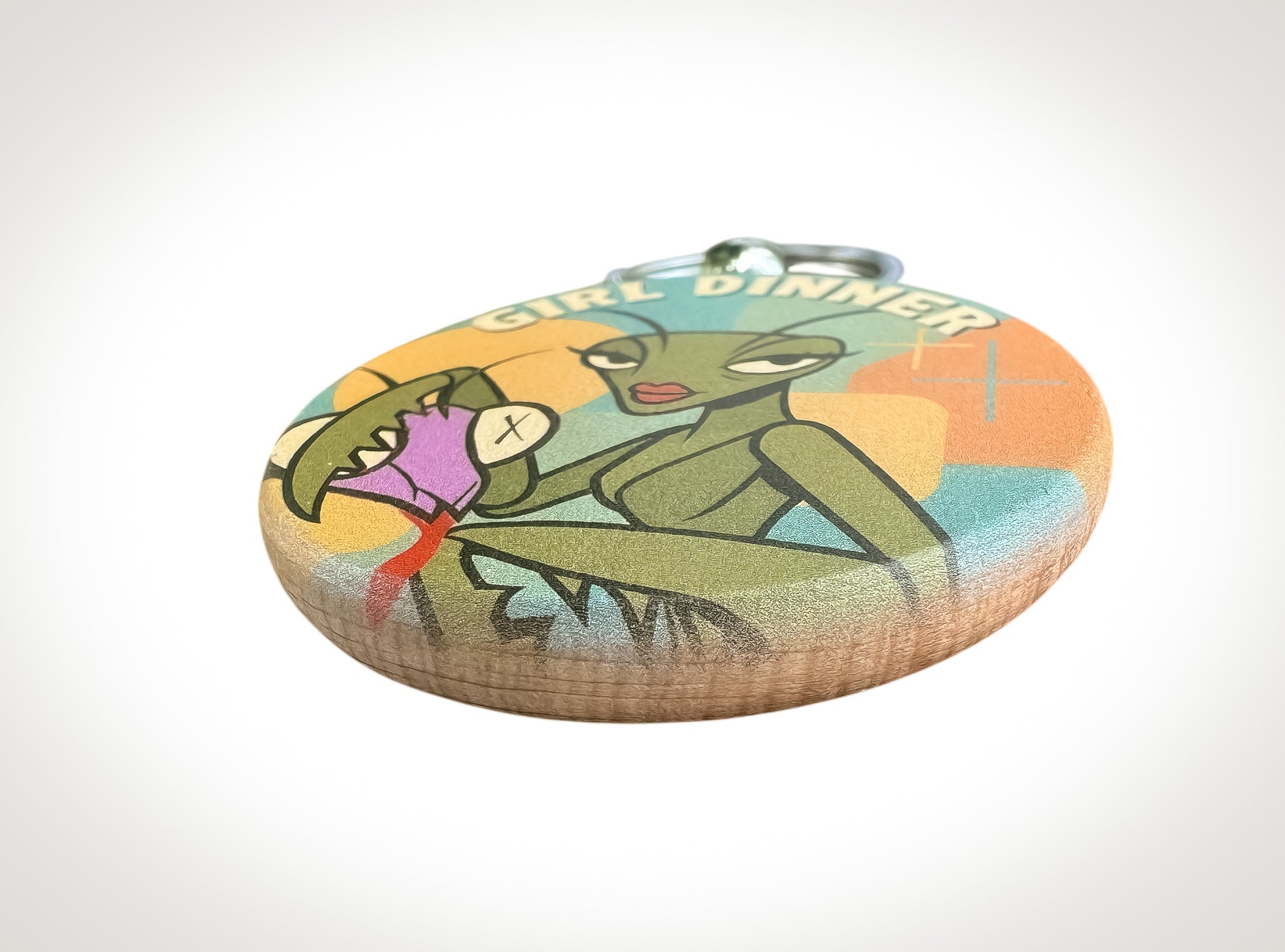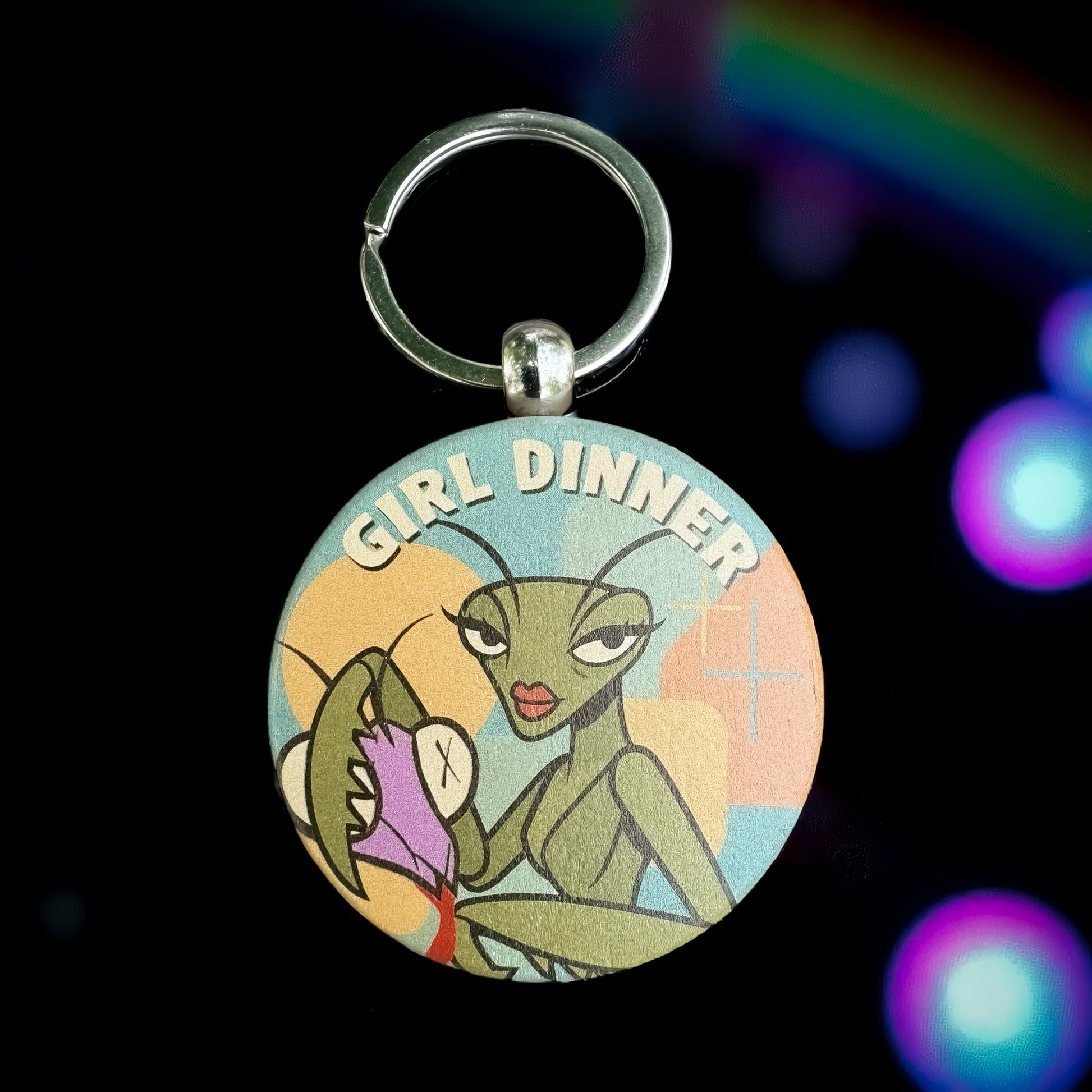 Embrace your unique sense of humor with this one-of-a-kind hardwood keychain, featuring a vibrantly illustrated praying mantis enjoying her infamous "Girl Dinner." This witty and artistic accessory is perfect for adding a touch of personality to your keys, backpack, purse, or even as a playful zipper pull.