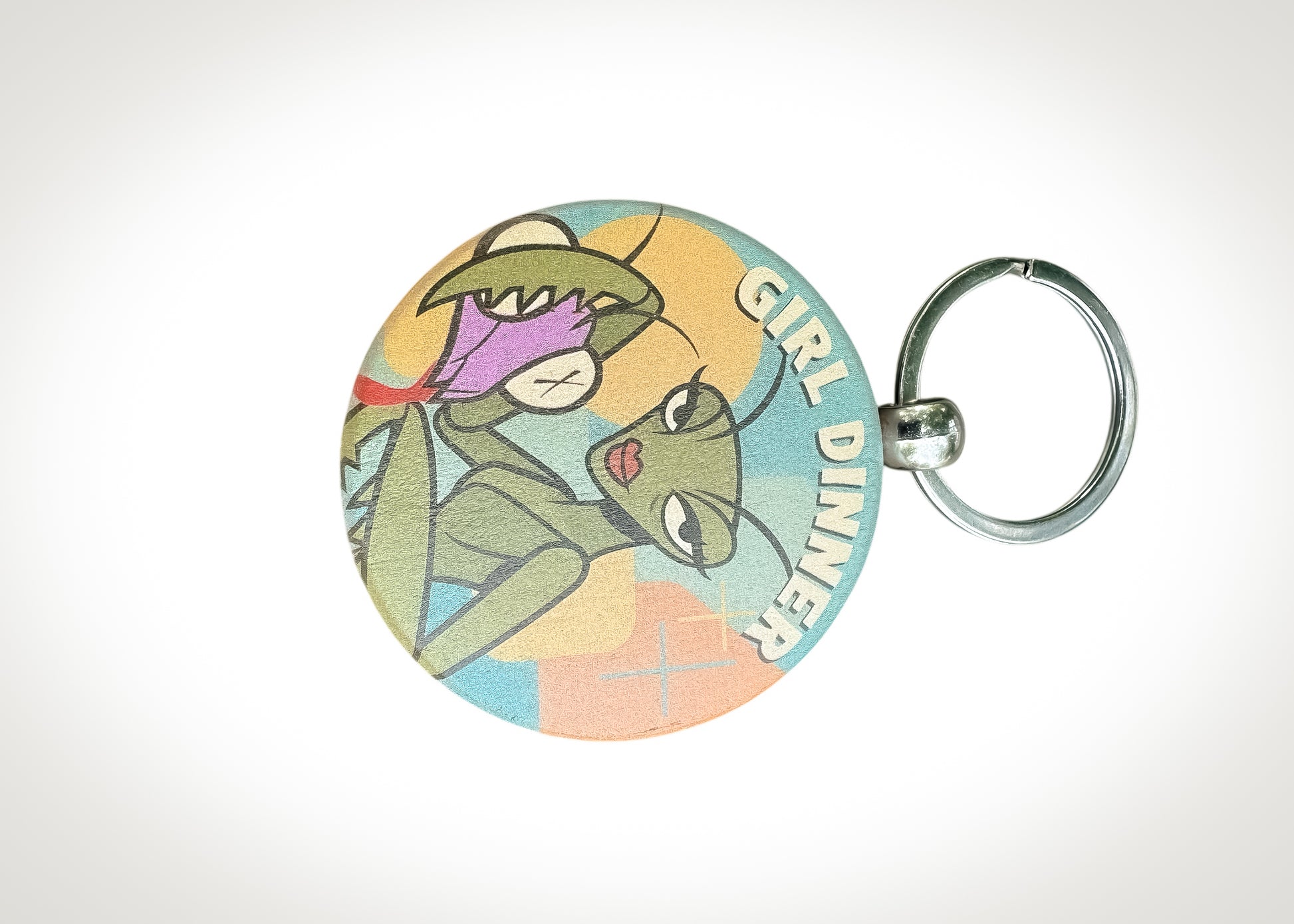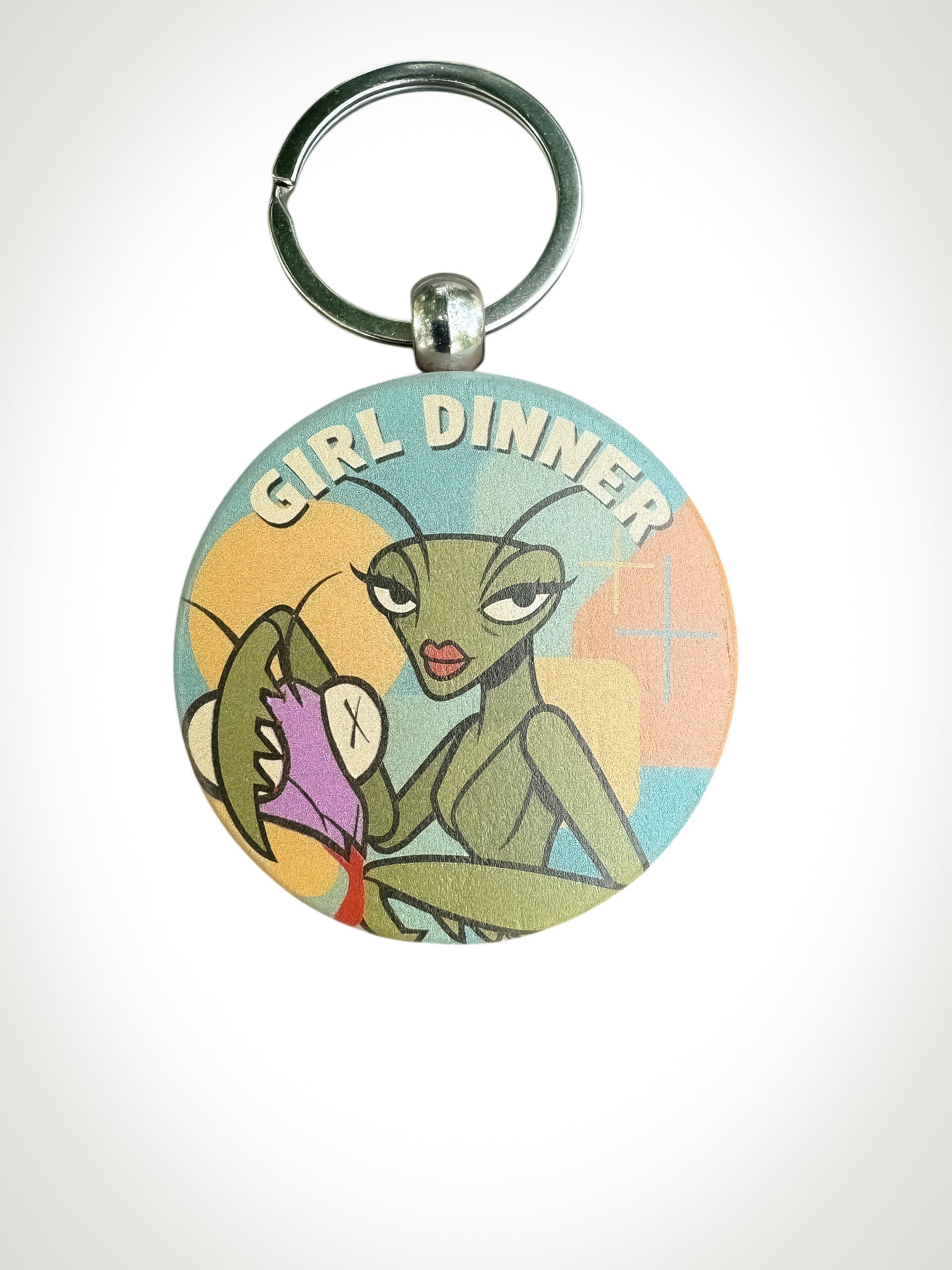 Design: Circular keychain with praying mantis and "Girl Dinner" text.