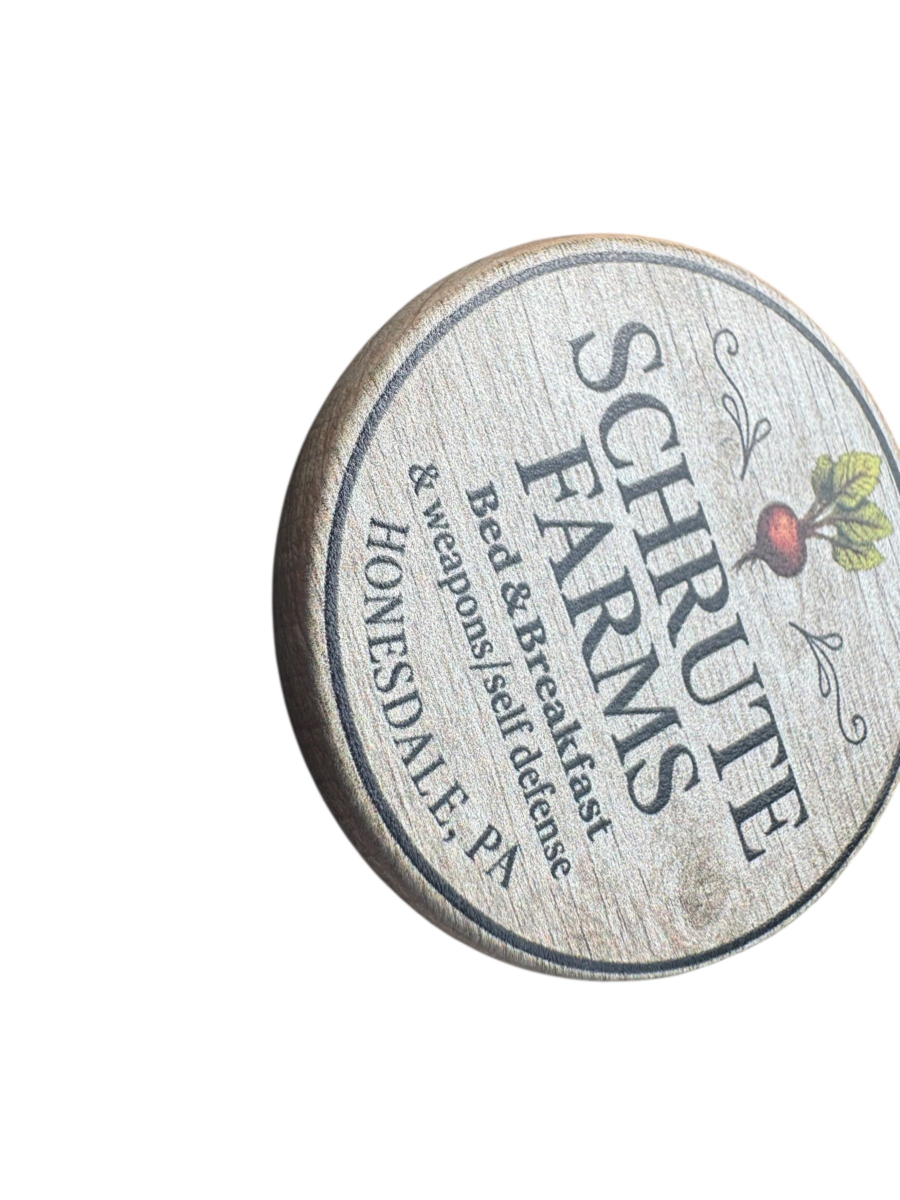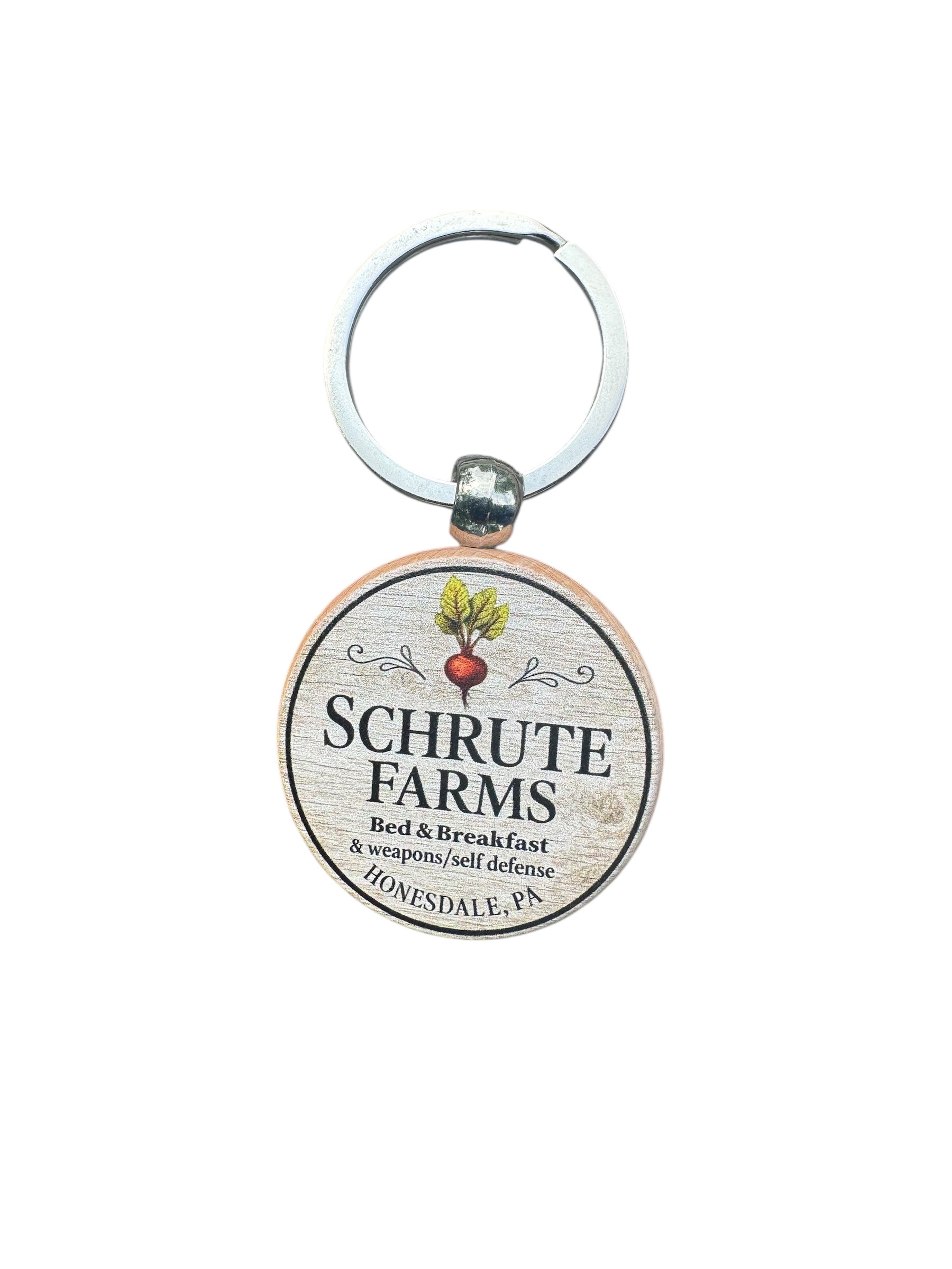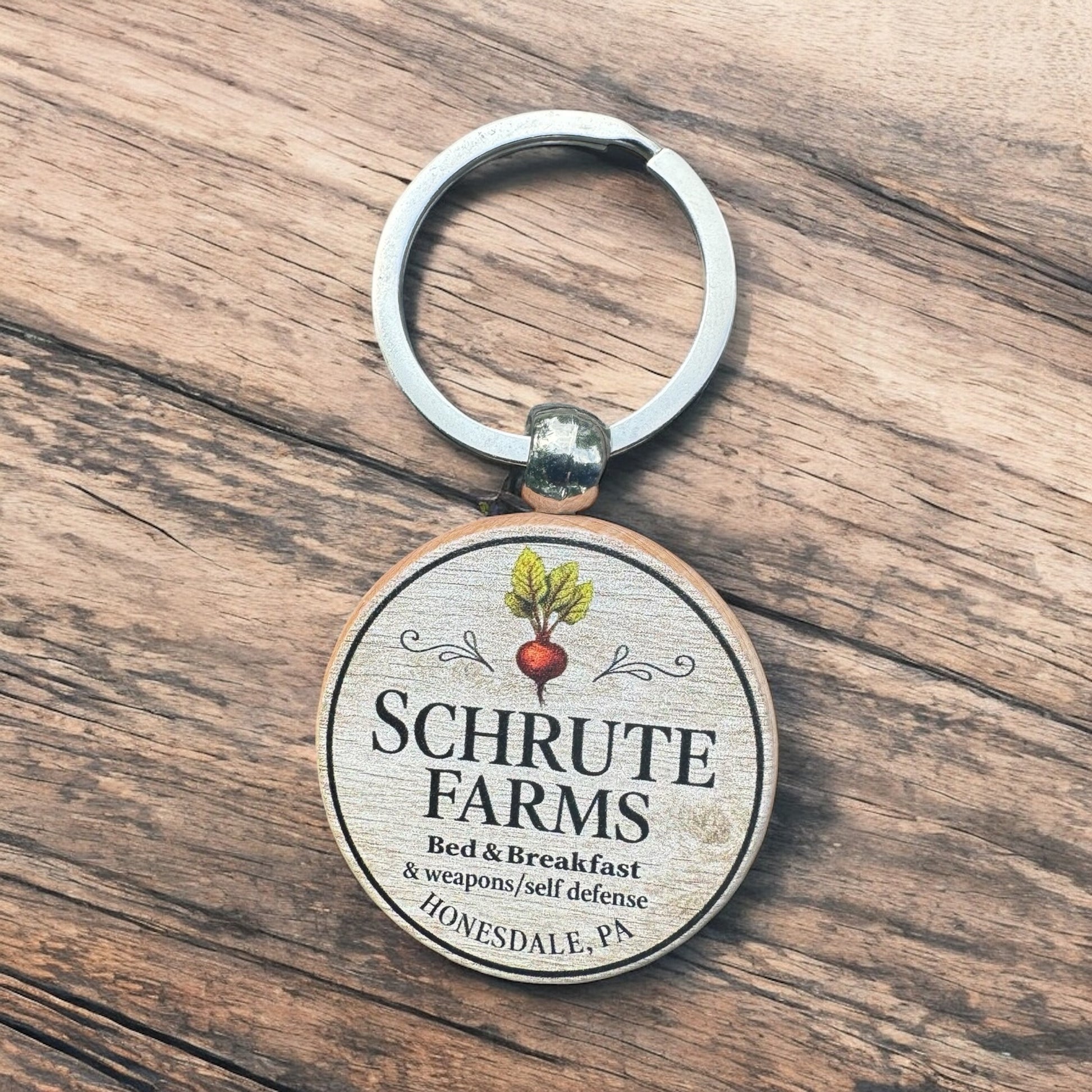 Schrute Farms Keychain, Funny Office Inspired Gift, Wood Round Keychain, White Elephant Gift
